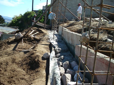 This our 6 foot holes and 3 foot trenches filled with concrete! This was all done by hand…meaning we mixed the concrete with shovels, filled buckets with the concrete, then passed it down a line to be poured in the hole. Something s satisfying to do this by hand. Gotta love 3rd world construction!