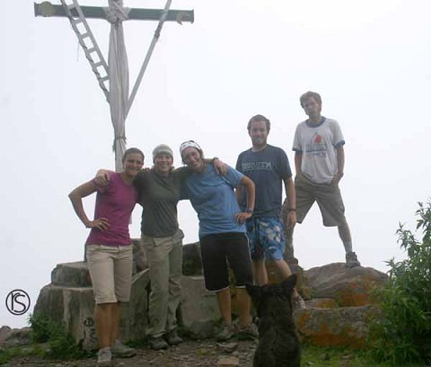 The five of us (and Fido in the foreground) at a cross on the way up.