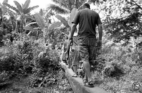 walking across man-made log bridges