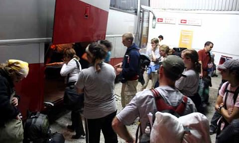 Getting our stuff off the bus in Palenque after about a day and a half on the bus.