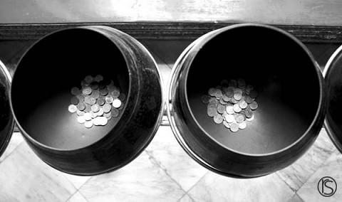 people got change, then dropped one coin into each of these pots as some kind of offering