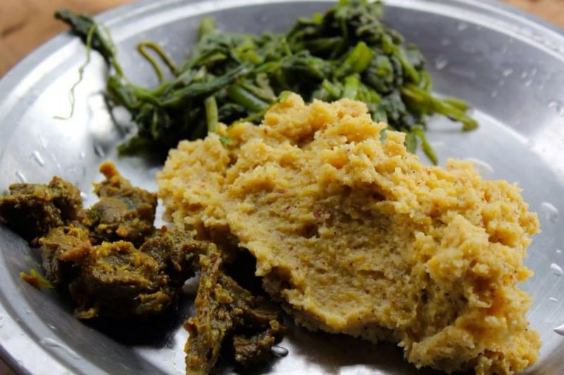 Ugali (cornmeal dish), Curry Chicken, and Pumpkin leaves (similar to greens).