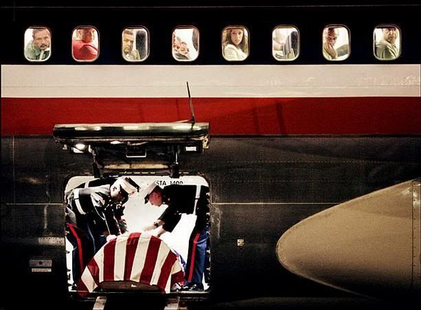 After the plane landed and as we were taxiing to our gate, I could see a long line of police/emergency vehicles waiting along with a small crowd of people who I can only imagine to be his family/friends. So we stop and the serviceman at the front leaves the plane. Finally they announce everyone else can leave too, but let us know we can stay if we want to until the coffin is offloaded into the waiting hearse.