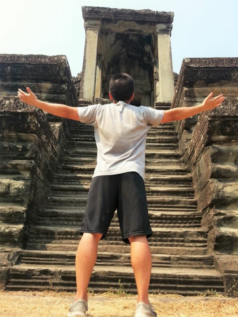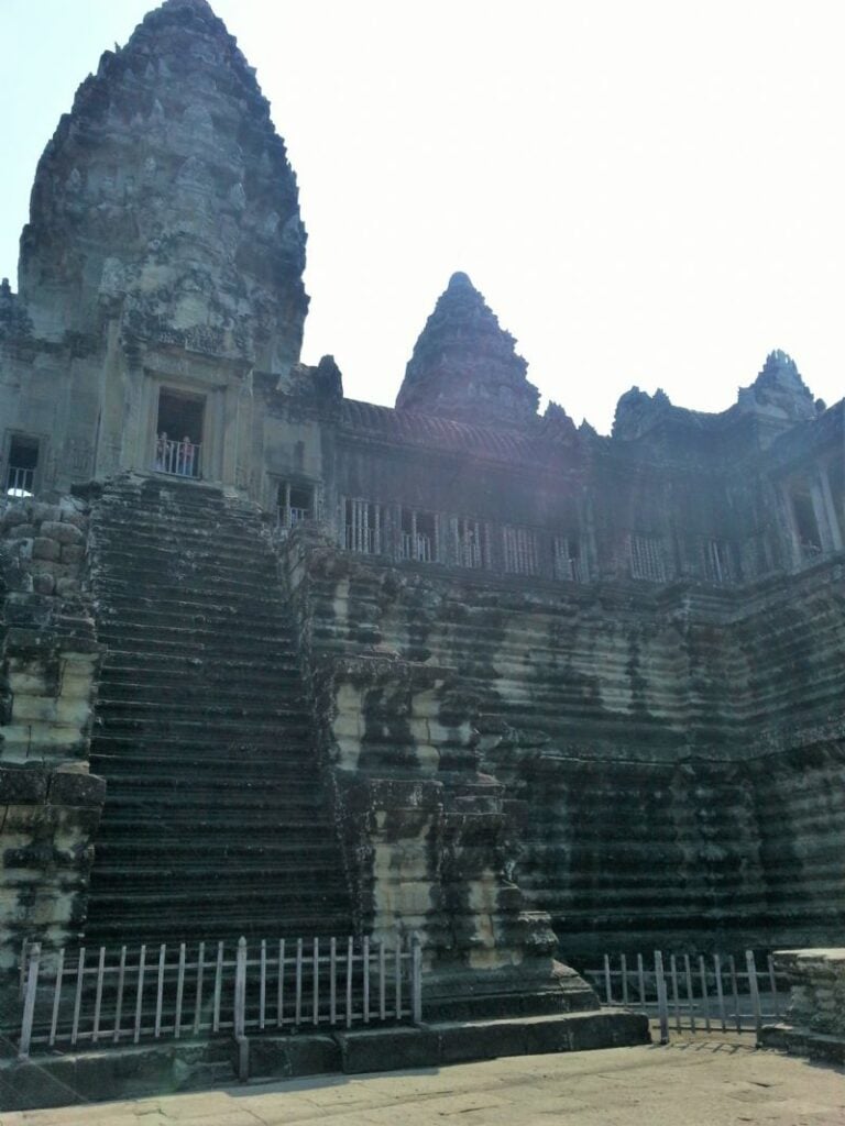 [Angkor Wat – Inside] Once you get inside, there is another long walkway to the main temple…which is also surrounded by a small moat. You can then climb up to the top of the main towers, but there was a line that literally went around the entire tower base. We didn’t have time for that, so I decided to just take a picture in front of a few steps!