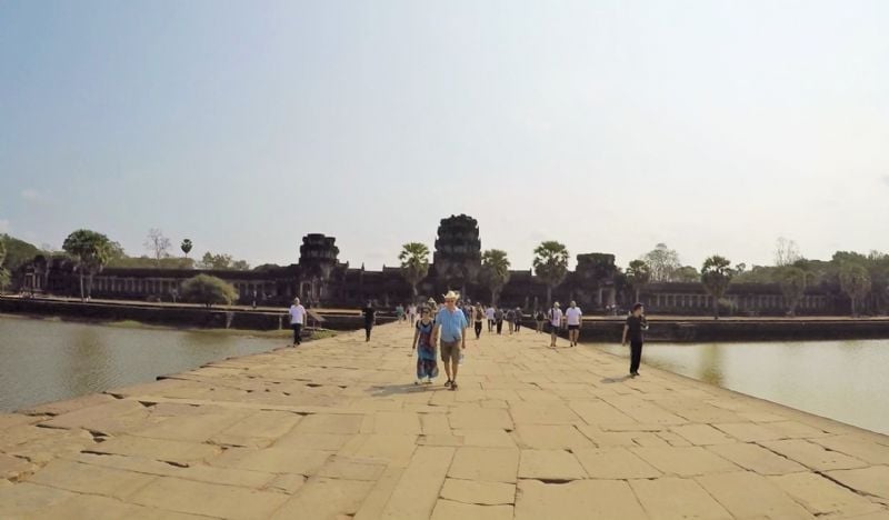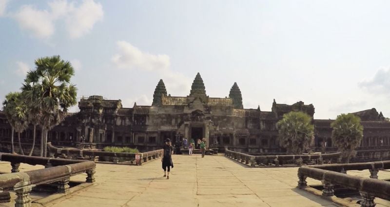 [Angkor Wat – Outside] The main temple in Angkor Wat is protected by a massive outer wall and surrounded by a moat. The initial view and walk-up to the temple is impressive and stunning — you can’t help but stand there, admiring the beauty. But a few of us tried to capture it anyways!