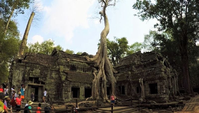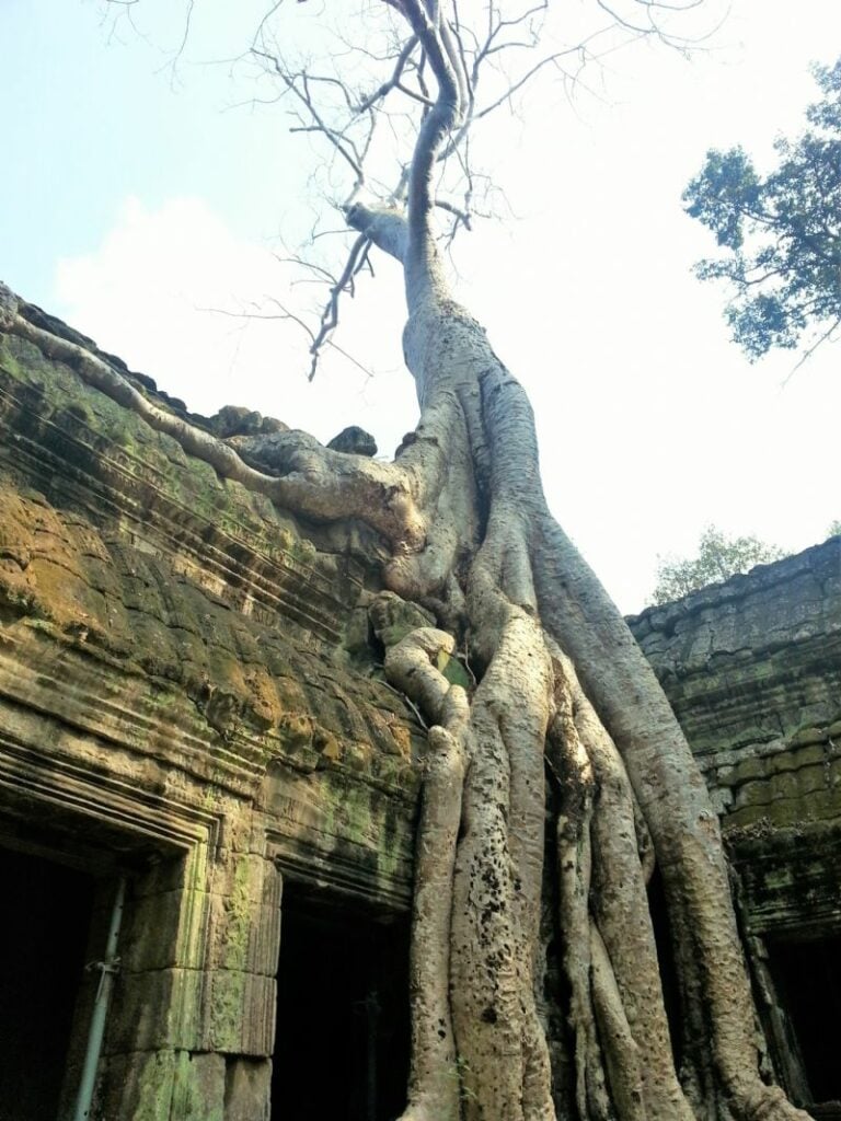 [Temple at Ta Prohm] Another popular attraction within Angkor Wat are the many large trees that have grown in, out and around its temples. So for our last stop, we visited the most popular of them all — the Temple at Ta Prohm. And why is it so popular? Because it was used in the filming of the movie Tomb Raider!