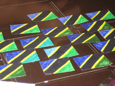 Why don’t we make some Tanzanian passports for the twenty kids, ages five and six, and draw some little flags they can affix inside them, I wondered. It took ten pieces of green construction paper, a little over ten sheets of plain paper, some markers, staples, scissors and tape to make the passports and flags. Christi colored twenty small Tanzanian flags and we drew and colored (some not so accurately) forty flags of Japan, France, Ireland, the U.S., Canada, Italy, Romania, Honduras, Sweden, China, India, the Philippines, Uganda, Kenya, and South Korea.