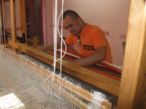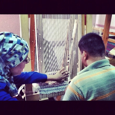 Weaving with an actual loom. Very, very difficult. They were so good at it!!