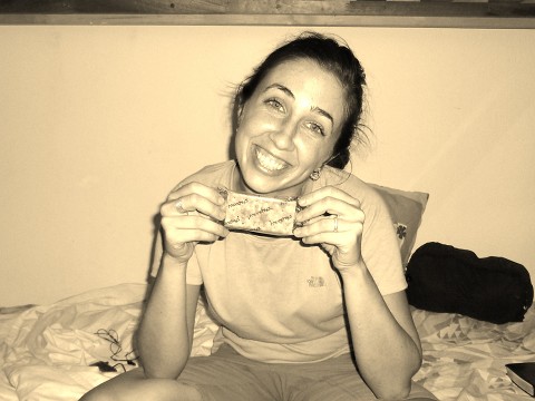 On my bunk bed at the apartment…I’m holding a fave snack–Munchys