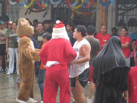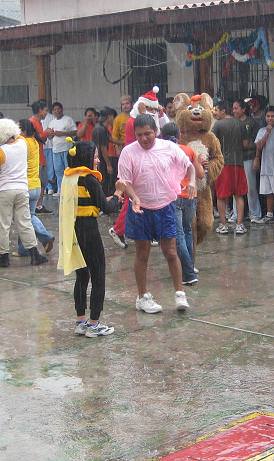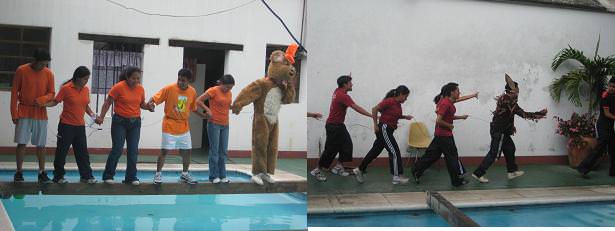 One day there was a party slash competition at the hospital. From what we can gather… people were divided into colored teams with mascots… and then completed tasks all over the hospital. Here you will see Team Bear crossing the pool and Team Construction Paper Donkey running off to their next event.