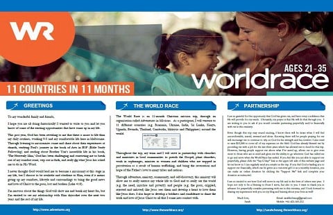 The World Race is an 11-month Christian mission trip, through an organisation called Adventures in Missions. As a participant, I will venture to 11 different countries (e.g. Romania, Ukraine, India, Sri Lanka, Kenya, Uganda, Rwanda, Thailand, Cambodia, Malaysia and Philippines) around the world.