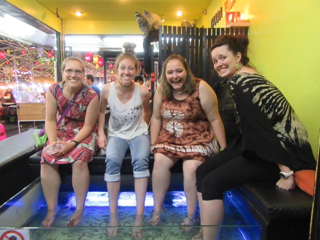 Shortly after we arrived, we did a scavenger hunt around Chiang Mai. Here are a few pictures. Side notes – I still HATE crossing the street; the temples here are plenty and beautiful; I ate a cricket and let sucker fish eat the skin off my feet! 😉
