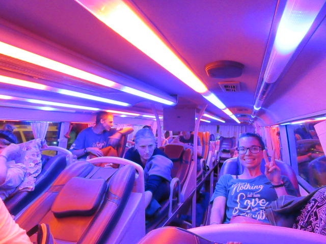 The bus finally pulled out of the station as we all felt a little bewildered and frustrated with all that had just happened… As we tried to settle in to our seats, the lights and music came on. There was a music video blaring, presumably of some famous Vietnamese singer, and the lights on the bus were reminiscent of a dance club setting. We were on our way in the “party bus!”