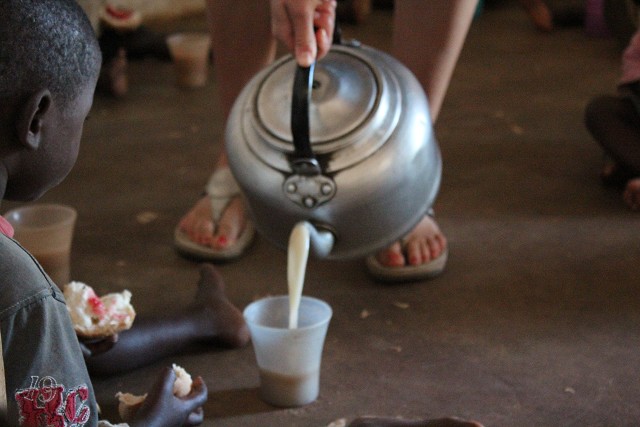 children share their snack of bread and tea. It is truly a