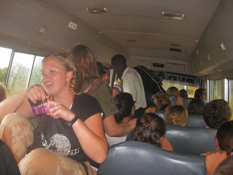 noon – Stop to pick up 2 teams, but wait the company made a mistake and sent a bus with not enough seats. So, how can we fit 27 people and all their packs in a bus with 24 seats. Oh, now its pouring down rain and packs are getting soaked. We decide to use the back row and the aisle (which contains 3 jumpseats) for packs. That means that several people have to ride on the bags. Although we are crammed in like sardines with only dreams of leg room or even empty laps, we have everything and everyone in the bus.