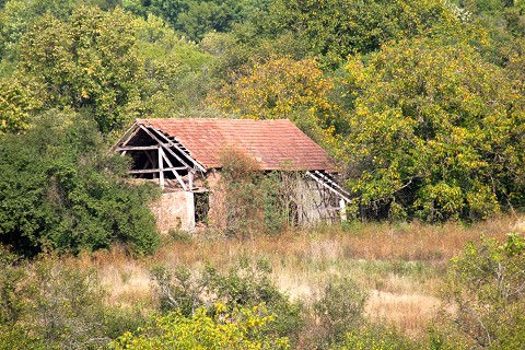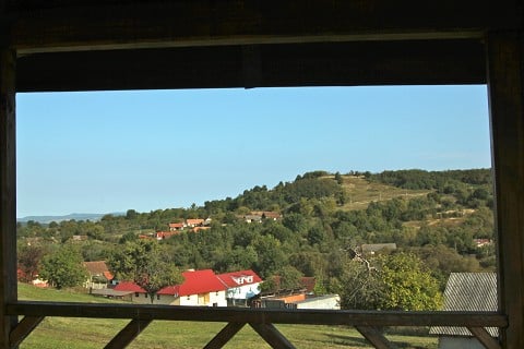 A view from the upper level of the cabin balcony, looking down toward Sistarovat and the house we are staying in (with the red roof).