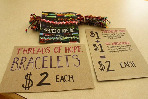 It began with a carefully devised plan to show up to a swim meet (for the team from the pool I work at) and sell Threads of Hope bracelets. It was simple enough, minus the predicament that this was an away meet and it was unlikely that anyone would recognize me or naturally welcome me with open arms. I decided to go anyway, dressed in the attitude that regardless of whether or not they kicked me out, it was at least worth a shot.