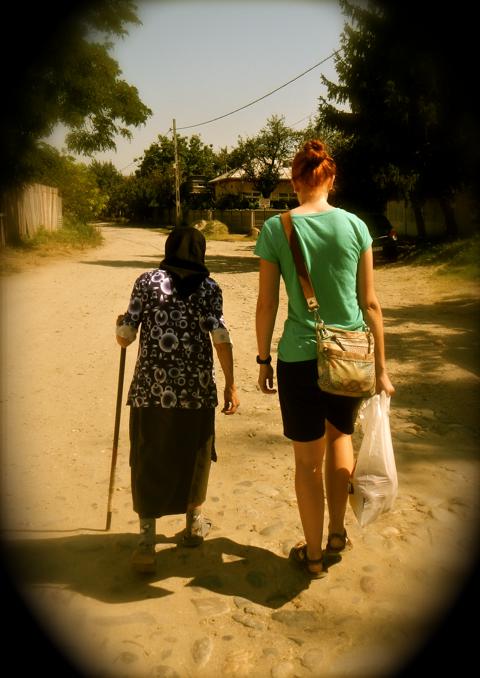 The lady kept talking to us, but seeing as we can’t speak Romanian we didn’t understand a word she said. We followed the lady for about 25 minutes as she shuffled along back to her house. I kept thinking of how much effort it would have been for her to even walk to the market and back, much less with a 30 pound bag of potatoes. She had tan, weathered skin and I kept imagining how hard she had worked during her lifetime. Her grey hair peaked out of her headscarf and she wore tall, grey, cat socks with her sandals. Her eyes were sunken into her face, and when I looked into them I saw a woman of strength and perseverance.