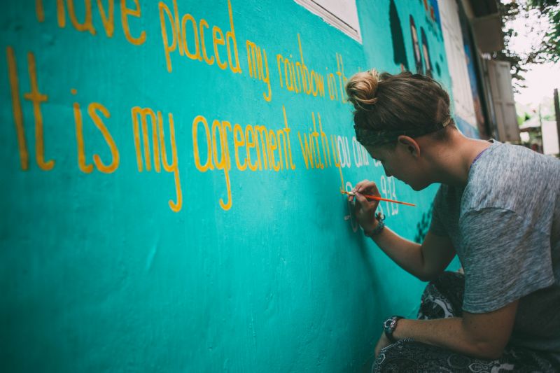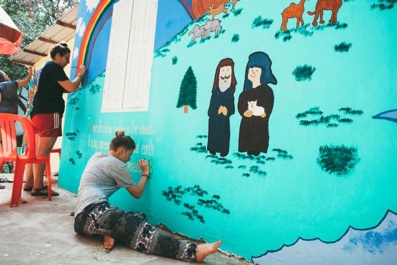Our incredible squad leader used her artistic abilities to trace a mural on the wall and we worked to paint it in.