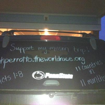 - I decided to make my car into a portable billboard and have had so many people ask me about it. Two older gentlemen have even given me money on the spot! Last week, I stopped at Wendy’s and as I was standing in line, this man walked up to me and asked where I was going on my mission trip. I gave him the short 2-minute spiel about the World Race. He told me he would LOVE to go on a mission trip some day. I encouraged him that he is not too old to do so and should certainly look into it. ((Just proves that you never know who is watching or paying attention to what you’re doin!))
