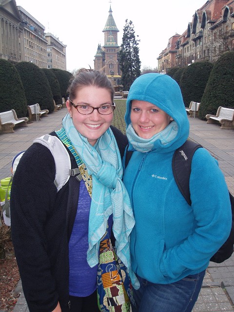 Hannah and I all bundled up while touring Timisoura, Romania on a train layover