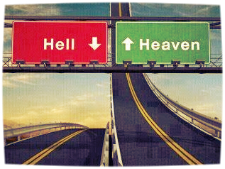 What this picture says to me is three things: ONE. Hell is the hard way out. All you have to do is inch on down to the sign and let go of the peddle. You'll be in for one "hell" of a fall and have an extremely sore toosh. TWO. For the road to Heaven, there is no way possible for my car to get up that high of an incline. THREE. But my car doesn't go to Heaven. I'm escorted by my Father, who picks me up in His best shiny new limousine/carriage/ferrari/spaceship/convertible/you get the picture. This illustrator messed up big time.