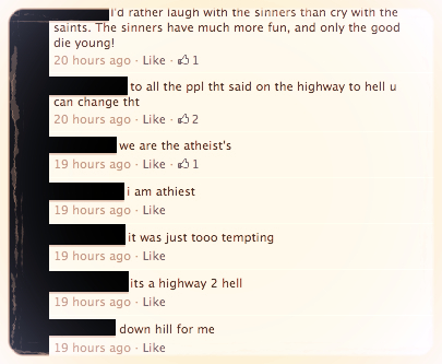 This picture came up on my facebook news feed tonight, and I began to read some of the comments left by people all around the country. To spare their identity, I blacked their name and pictures out. They were called to like the picture if they were going to Heaven, and comment if they were going to Hell.