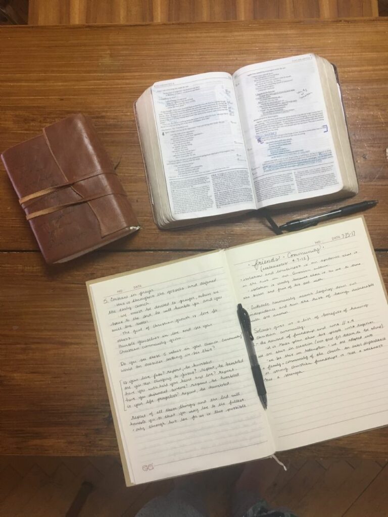 My notebook laid open, with lots of notes on Podcasts and passages of scripture, my bible, written in, worn and ragged from these last 8 months of traveling, and my journal, leather, beautifully bound with a scripture burned into the front.