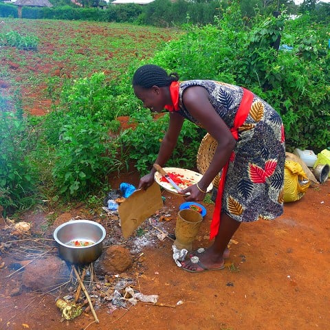 Here is Mercy cooking up an amazing meal of chapati, ugali, rice, chicken, and plantains.