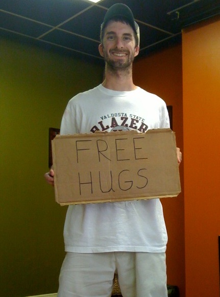 OH! I gave out some FREE HUGS on my campus today too during a Large once a year event at Valdosta State called The Happening.  I stood in the Blazin heat for 3 hours with a simple cardboard box with the infamous “Free Hugs”.
