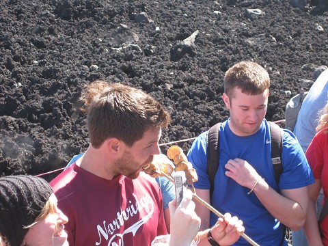 different ministry locations for the duration of the month, but it was also the first of many adventures and “firsts” to come. The ride was great, but we eventually came to a point on the trail where we had to dismount our horses and begin a hike over steaming lava on foot. It was about 20 minutes into our hike that our Pacaya guide took a tree branch and stuck it into a hole in the ground that I assumed held lava a few feet below. Almost instantaneously the branch became a burning bush, and you know what that means….bags of marshmallows flew open and the celebration began! 🙂