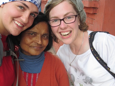 We caught a bus in the right direction, and began relying on the native Nepalese to speak English and know where the “Standard Charter Bank” was. After a few failed attempts, a younger man got on the bus and was able to understand what we were asking about. He talked with the driver and the doorman and reported back to us that they understood and would make sure we got off at the right spot. He said it would be a half hour from where we were, already an hour into the trip. It was actually at the two-hour mark when we were finally ushered off the bus. We began walking and found a police visitor info booth. They pointed us up the street and we began walking. We asked a shopkeeper after about 5 minutes and he pointed in the same direction. Dani bought some shoes and socks and we walked, walked, walked some more. We never saw the SCBank so we asked again. This time an older woman and an older man argued about whether the walk back, in the direction we came from, was 7 or 12-15 minutes to SCBank. Mrs. Lall, as we came to find out her name, was aggravated at the man’s obvious ignorance, so she took us by the hands and led us down the street.