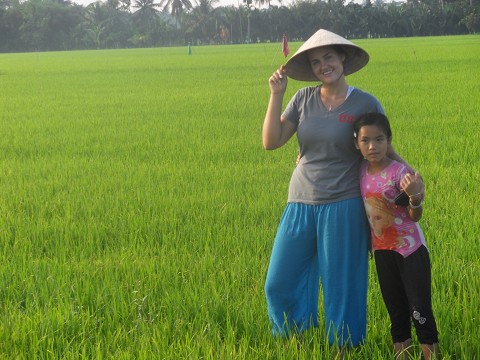 My team and I slept on our cots and sleeping pads surrounded by bug nets that night. The house was very basic with concrete everything and no windows, just shudders and open doors. I woke up Sunday morning at 5 am and tip toed to the bathroom to brush my teeth and wash my face out of a bucket. When I looked outside, there were chickens, ducks, puppies, trees and fields everywhere. The simple farm life reminded me so much of my childhood. I was able to collect the eggs cooked for breakfast and then we all walked to the market to get materials for lunch. About fifteen kids joined us as we walked and ended up following us all day. Tourists never go to Ming Thit, so we were quite a crowd pleaser!