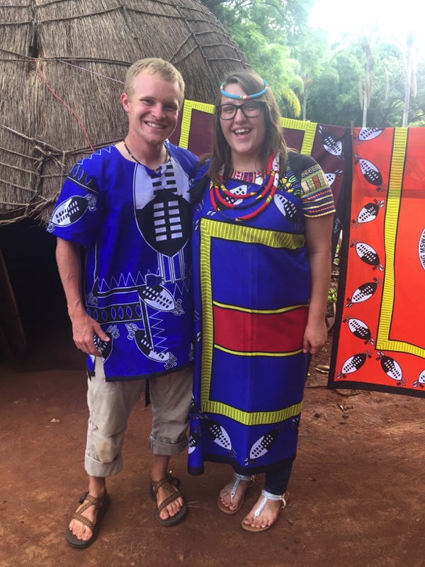 Our friends pointed us to a taxi and finally we were on our way! On our way to the festival we had our taxi drive us to a market that sold traditional Swazi clothes. We went up to the market and immediately two women started putting clothes on us. Bill tried on several tops while the two women put several clothes and necklaces on me. I felt like I was playing dress up. It was honestly a lot of fun. I’m pretty sure the ladies at the market thought that Bill and I were married. They kept taking pictures of us, and stopped trying to sell me items when Bill told them I had a budget. Finally I got my dress, and Bill got his top and we were on our way to the festival!