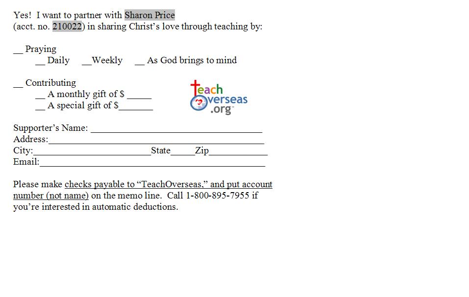 as allowed by law. Checks should be made out to “Teach Overseas”
