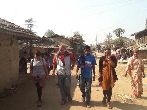And then, we walked: down the street, through the alley on the dirt road past the goats, the buffaloes and the dry corn: to the street with Nepali prayer flags into a small house. The girls went in, crammed on her bedroom floor.