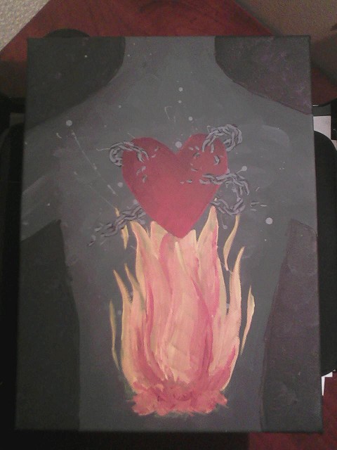 Since being in Georgia, I have had the opportunity to arrange “Art Nights,” a night where anybody is welcome to join together and express their worship through art, dance, writing, singing, playing… even baking! Our night was incredible, and when I painted this piece I saw the Holy Spirit building a fire in my belly, and only then could the Lord break the chains off of my heart.