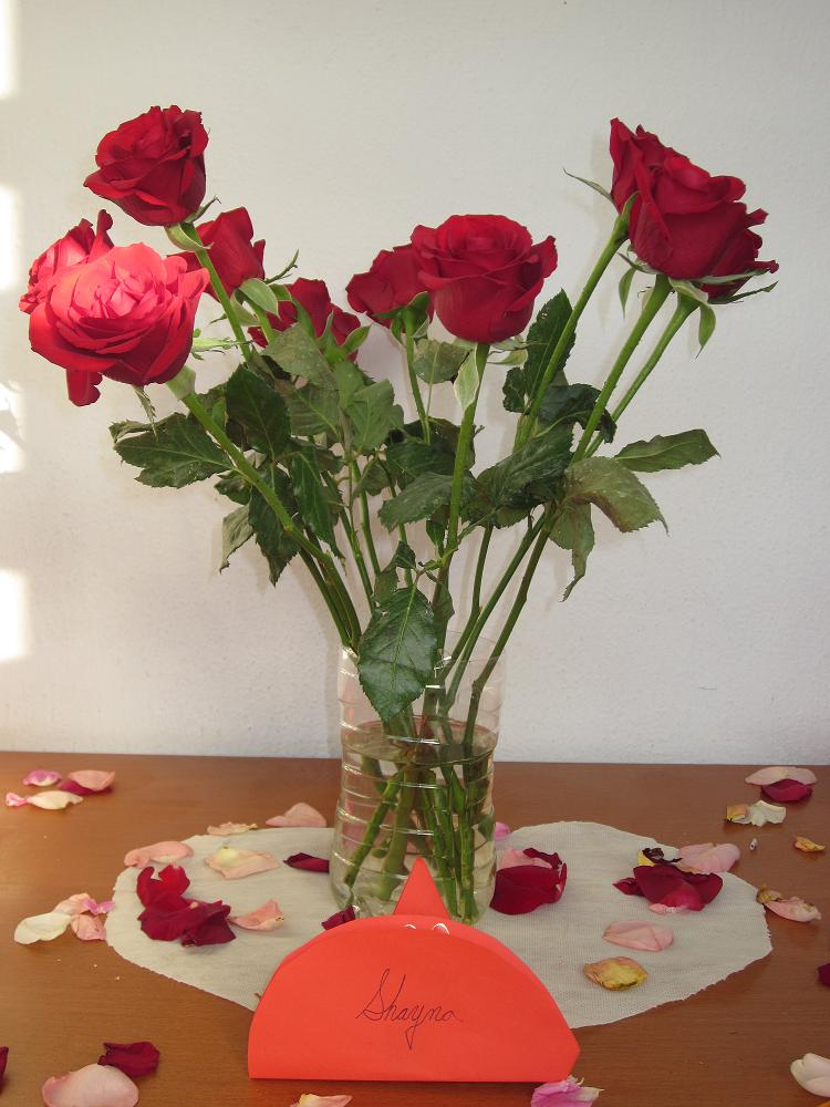 apartment. A dozen roses on the kitchen table surrounded by rose petals and