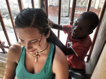 All the girl's playing with Julie's hair in Carrefour, Haiti.