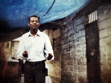Preaching about 'faith' for church under the blue tarp – on the streets of Carrefour, Haiti.