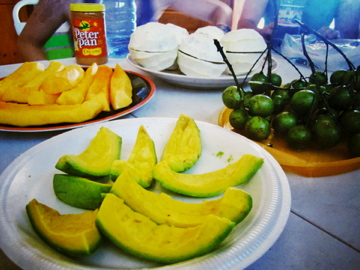 Here is a photo of one of my delicious breakfasts – fresh fruit – mangoes, papaya, oranges, and 'catnips', and fresh avocado.
