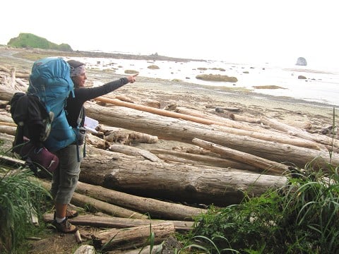 Lisa pointing out across the ocean towards Japan on our backpacking trip!