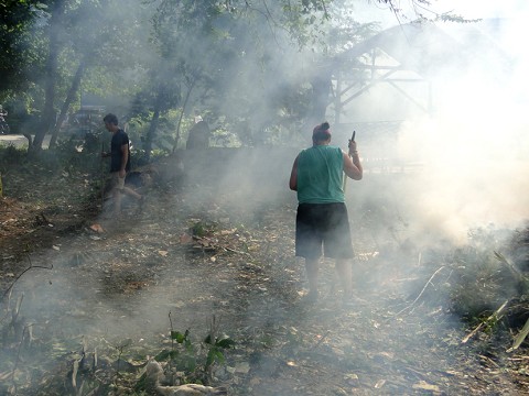 The war has gone on for two days now and we have made some serious progress. Several piles of burning trees and brush lay scattered about and light is shining through, revealing what is finally looking like a clearing. Though the war is far from over and I am sure to sweat another gallon or two as we attempt to complete this massive ordeal, slowly Pastor Al’s vision for the land is coming to fruition.