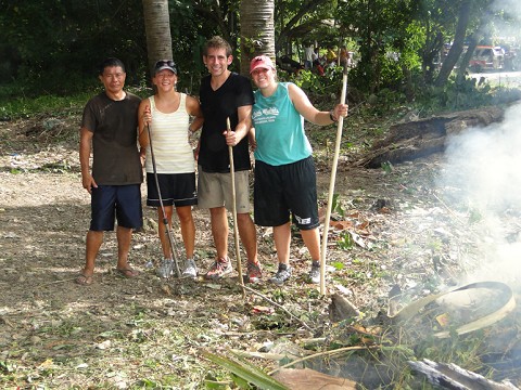 Unfortunately, creating a soccer field isn’t as simple as finding an open space and placing two goals. Rather, it means our team and several locals declare war on a section of dense forest. Using machetes, rakes, fire, and simple brute strength we have poured our blood and sweat into clearing the space. The forest has fought back with everything that it has… fire ants attacking our ankles, spiders falling on our backs, snakes racing out of holes, and I swear I had a scorpion climb on my leg. We are all a bit torn up, sore, and bruised but we continue to venture forward.