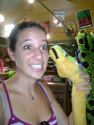 <– This is me at the zoo being attacked by a snake. Notice the Keyna and Tanzania signs in the background. Completely unintentional. Rather ironic.