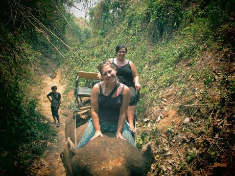 Next stop, elephant riding! What beautiful creatures! Half of our party went on the elephants initially, we heard screams and squeals while waiting and wondered why…. then we had our turn. We began walking down the trail following our friends, which was a steep hill and we had to hold on very tightly and started getting a bit frightened as we felt that we could fall off the seat we were on. We continued on when our “driver” decided to hop off the head of the elephant and leave us at the elephant’s disposal. For some reason our elephant decided to take the lead. He was soon distracted by some grass up the steep side lining the trail, he proceeded up the side eating grass, until finally decided to resume along the trail, again walking down a steep hill leaving us to feel as though we could fall off the seat we were in. We then realized our driver was walking behind us, now, smoking a cigarette. We tried our luck with riding on the head of the elephant, which was pretty fun, but again, it kind of felt like we could fall off, and I got the joy of getting green plant snot shot up onto my face by the elephant who we named Bubba. Eventually I moved back to my seat alongside my friend, Marielle, and the driver hopped back on to resume guiding our elephant correctly. We continued to get green snot shot at us through Bubba's trunk, about 5 or 6 more times. Then, eventually, after a stop at a water hole, where we then got shot with water from Bubba's snout, we got onto the road with our elephant and driver and walked back to our starting point.