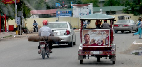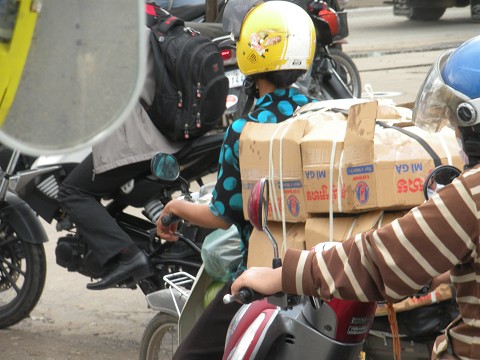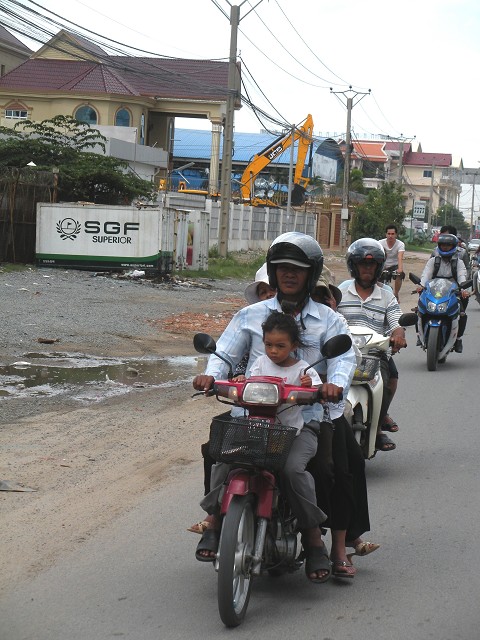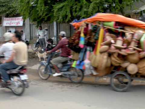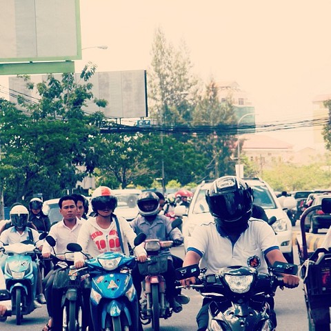 I find Cambodia to be such a beautiful country. I don't know what it is, but I really like this country. From the beautiful landscapes, to the traffic situation, which I find so comical. I wish I had more photos to share. It's not uncommon to see a family of 5 on a motor scooter, or, a driver, a giant box and another person barely sitting on the seat holding onto the box with feet dangling out wide. Let's not forget the motor scooters piled as high as they are wide (maybe 3 feet on each side beyond the driver) with baskets, or styrofoam. Traffic is thick and busy in a lot of areas, making crossing the street its own task. You quickly learn to just go for it, sometimes you need to stop for a moment in the middle of the road, but other times you can keep on going while watching the traffic swerve gently around you, adapting to your walking path. This is also seen with traffic. A vehicle will wait to make a left turn, but then the driver will slowly edge their way through and other vehicles will either stop, or ride around the vehicle.