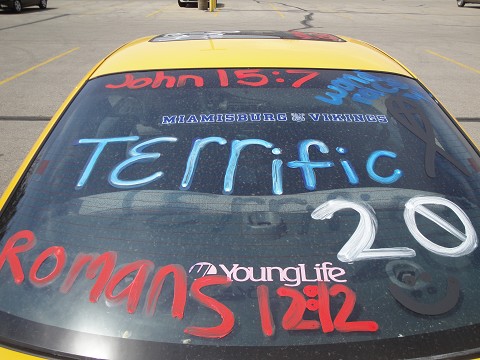 This weekend was my 20th Birthday, I am getting so old, I can now say I’ve lived through two decades. Woah weird! A wonderful 20 years it has been though, I wouldn’t relive any of it. Friday I went to leadership for Young Life and then Mongolian Grill with 24 people and hung out afterwards. Saturday I had family come in we enjoyed our time together then went to Red Lobster, and had an amazing Birthday dinner. Then I finished the night with a bonfire with some wonderful friends. Sunday, I had church and I am learning the meaning of community, I have a wonderful community of people supporting me which is truly amazing and I am so grateful. Sneaky Moe and Harmony wrote on my car while I was in kids church helping they are two sophomore girls I love and have reached out to.