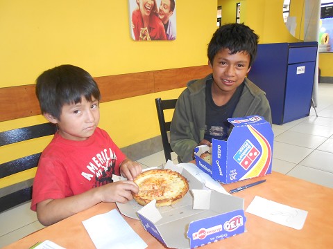 , because then lots of homeless people would want some, so I wasn’t sure how to handle that. But I just really felt like God wanted me to do that. By the time Jake was done talking, all the pizza was gone. I told my team that I thought God was telling me to buy a personal pan pizza and give it to someone in need. They were like “yea, sure, go for it”. I had no idea what I was doing or who to give it to, but I wanted to follow through anyway. After I ordered it, we saw two little boys just hanging around the outside of Domino’s just watching us and some other table of people eat. We decided to invite them into the restaurant to feed them if we could.
