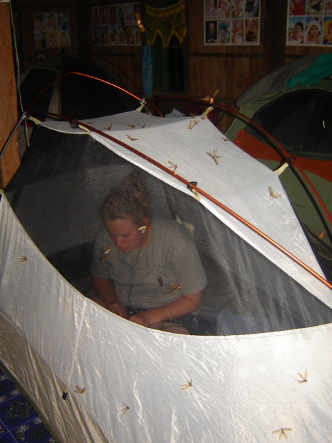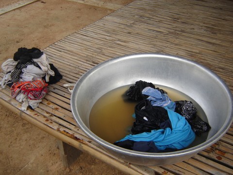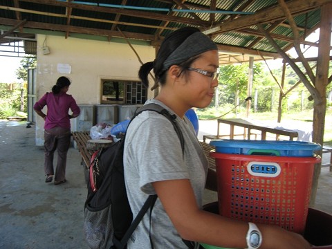 One wouldn’t think so, with the lifestyle my teammates and I now live. We live in an elevated wooden house with no furniture; our tents and mats, along with a few plastic chairs, are our only reprieve from the hardwood floor. The first night we were here, it was sweltering hot, and hundreds of winged termites swarmed into our room, dancing around our ceiling lights and covering our clothing and tents, shedding their paper-light wings all over our belongings. In the mornings, we wake up to the peeping of little chicks running frantically around their pens, and sometimes the hum of Buddhist chants blasting at unimaginable decibels from loudspeakers. In the yard next door, there are bananas growing from a tree over a barbed-wire fence. We do our morning jogs along a winding dirt path where we occasionally have to make way for ox-carts heading to the fields. Showers and laundry are conducted with water in large basins collected from the rain. At night, our sleep is occasionally interrupted by squawking geckos (who knew they made sounds?) and misinformed roosters reporting the sunrise at 3:30am. And one day, as I was beating off a nest of ants I had found gathering in my sweaty towel, I smiled to myself, my mom would be freaking out if she saw this! This was definitely unlike anywhere I have ever called home, but strangely it did feel like a home to me.